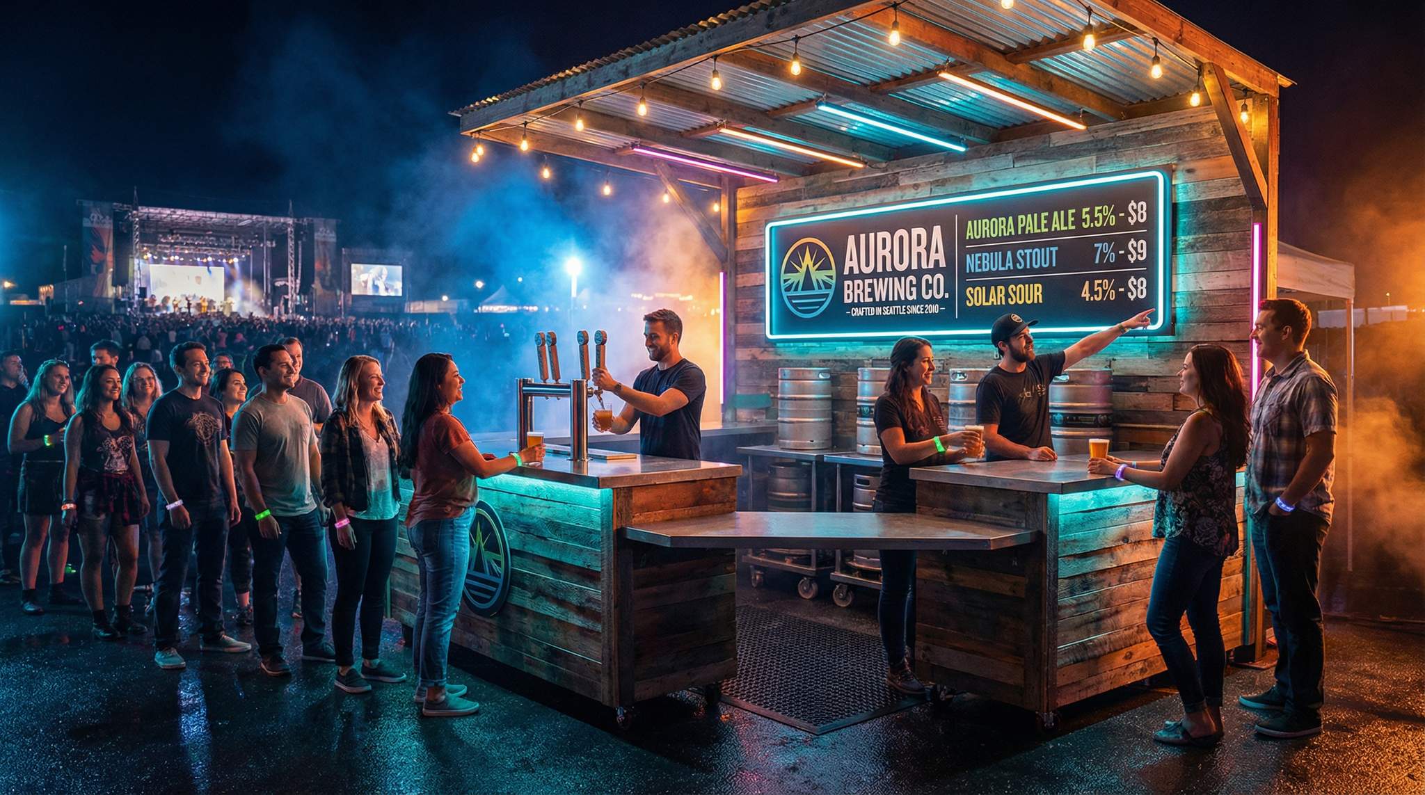 Lighting directly impacts service speed and sales by ensuring menus and products remain visible as venue lighting changes. Portable LED clips or strips help customers read tap lists without squinting or using phone flashlights, reducing ordering delays. Illuminated bottles and tap handles also draw attention to the booth, enhancing brand storytelling.