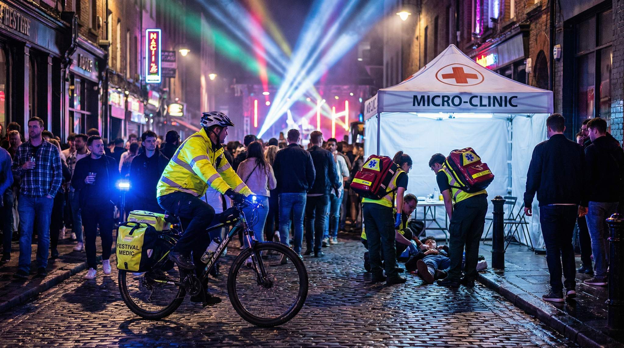 When a festival takes over busy city streets, delivering medical care becomes a creative exercise in mobility and planning. Inner-city festivals often mean packed crowds, blocked roads, and narrow alleyways – a challenging environment if someone needs urgent help. Traditional approaches like relying solely on ambulances can falter when traffic is gridlocked or pedestrian-only zones are jammed shoulder-to-shoulder. To keep attendees safe in these tight quarters, festival producers design medical operations that can move through congestion. This involves deploying agile responders (like bike medics and foot patrols), setting up micro-clinics in strategic spots, equipping teams with roving medical kits (including defibrillators), and coordinating closely with city emergency services. The goal is simple: reach patients quickly, treat effectively on-site, and smoothly integrate with external EMS when needed – all while respecting patient privacy amid the public spectacle.