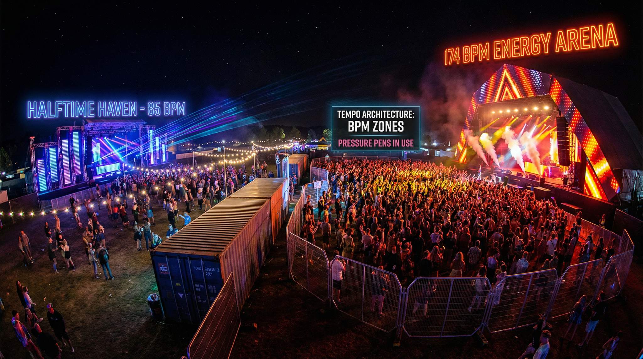 Tempo Architecture is a game-changing concept for bass music festivals that goes beyond lineup curation – it’s about designing your festival space by BPM and vibe. The idea is to dedicate separate areas to different tempos (for example, a halftime room, a deep 140 BPM zone, and a 174+ BPM high-energy arena) in a way that each can thrive without bleeding into one another.