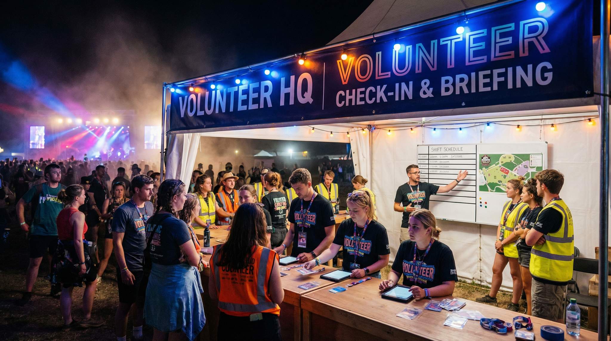 Every festival should designate a Volunteer Headquarters (HQ) – a clearly marked area where volunteers report in and receive instructions. This HQ serves as the central check-in point and information hub for all volunteer activity on-site. Key considerations for a functional volunteer HQ include: