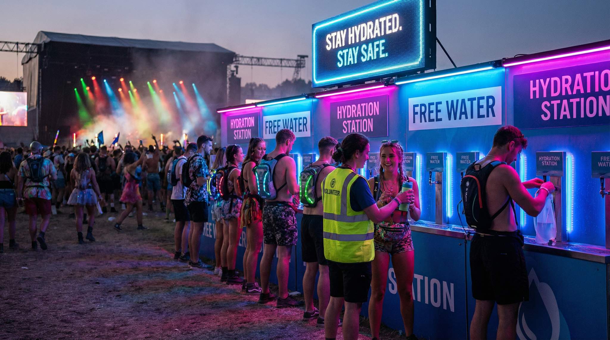 – Encourage Water Consumption: Use creative reminders to nudge attendees to drink water. Display friendly “Drink Water!” messages on stage screens between sets or on LED boards. Some festivals even get artists or MCs to occasionally remind the crowd to stay hydrated.