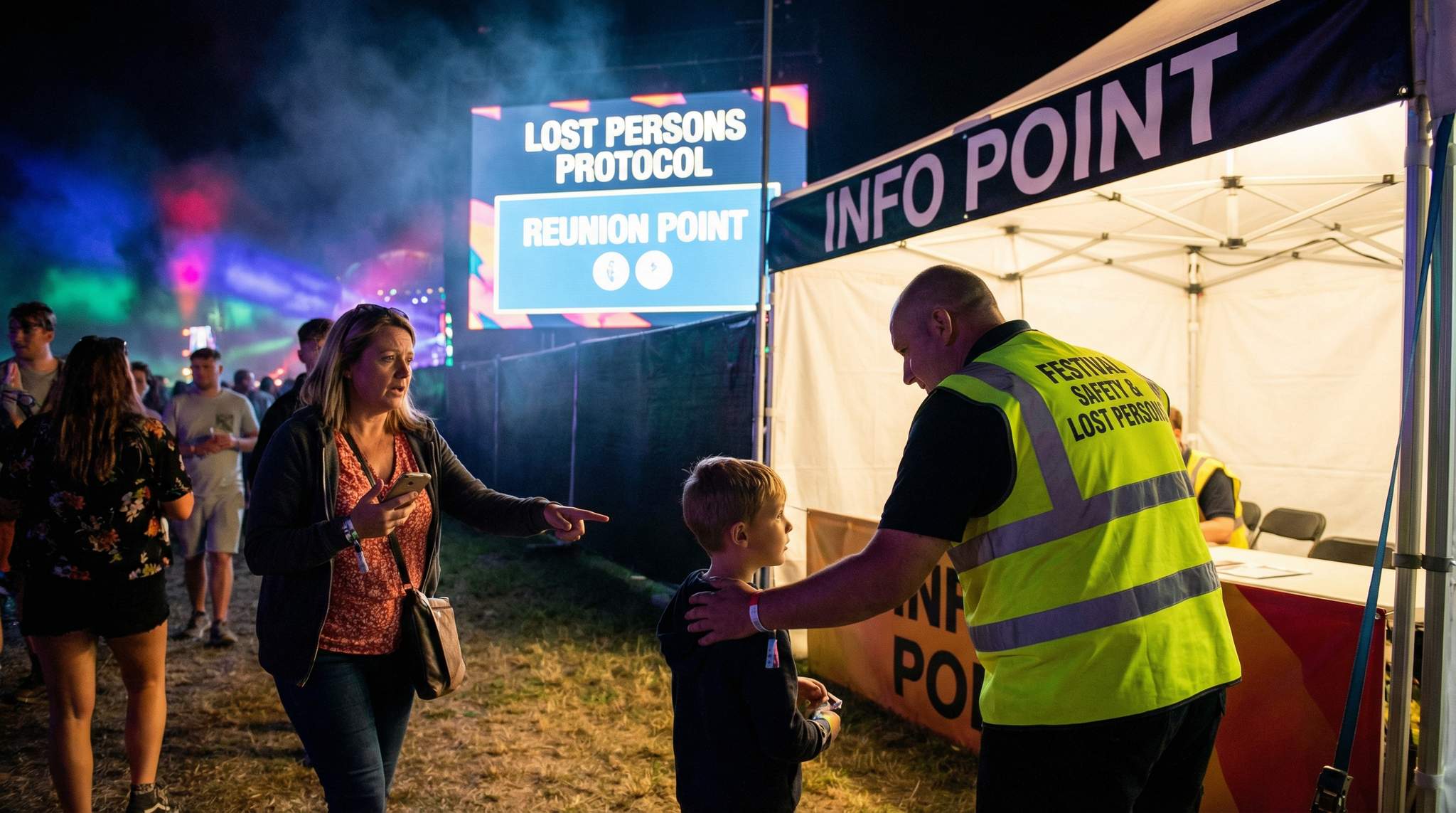 - Announce resources on-site: Throughout the event, occasional PA announcements or LED screen messages can remind people, Lost or separated from your group? Visit the Info tent for assistance without embarrassing anyone. This keeps the idea fresh that help is available if needed.