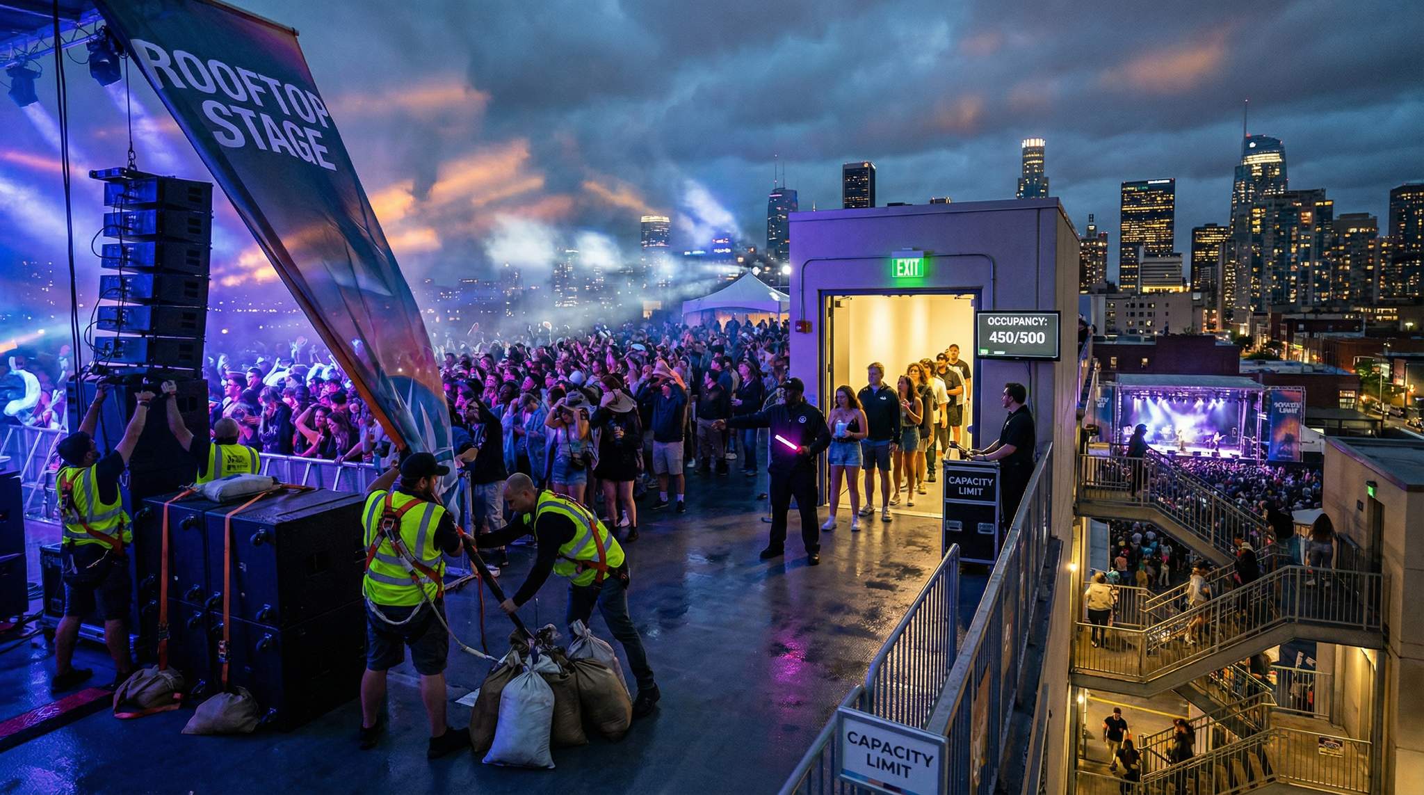A rooftop might have limitless sky above, but it definitely has limits on how many people can safely party on it. Always determine occupancy limits early, guided by structural engineers and local building codes. The structural load capacity of a roof or parking deck must support not just the static weight of equipment and infrastructure, but the dynamic weight of a dancing, jumping crowd. For example, a historic building in London or Mumbai might only allow a few hundred people on its roof, whereas a modern reinforced structure in Chicago could handle more – but never assume. Engage a professional engineer to assess the venue’s live load capacity and get a certified maximum occupancy number. Overloading a roof can risk structural failure, and authorities will also enforce strict occupant limits for safety. It’s far better to limit tickets than to literally bring the house down.