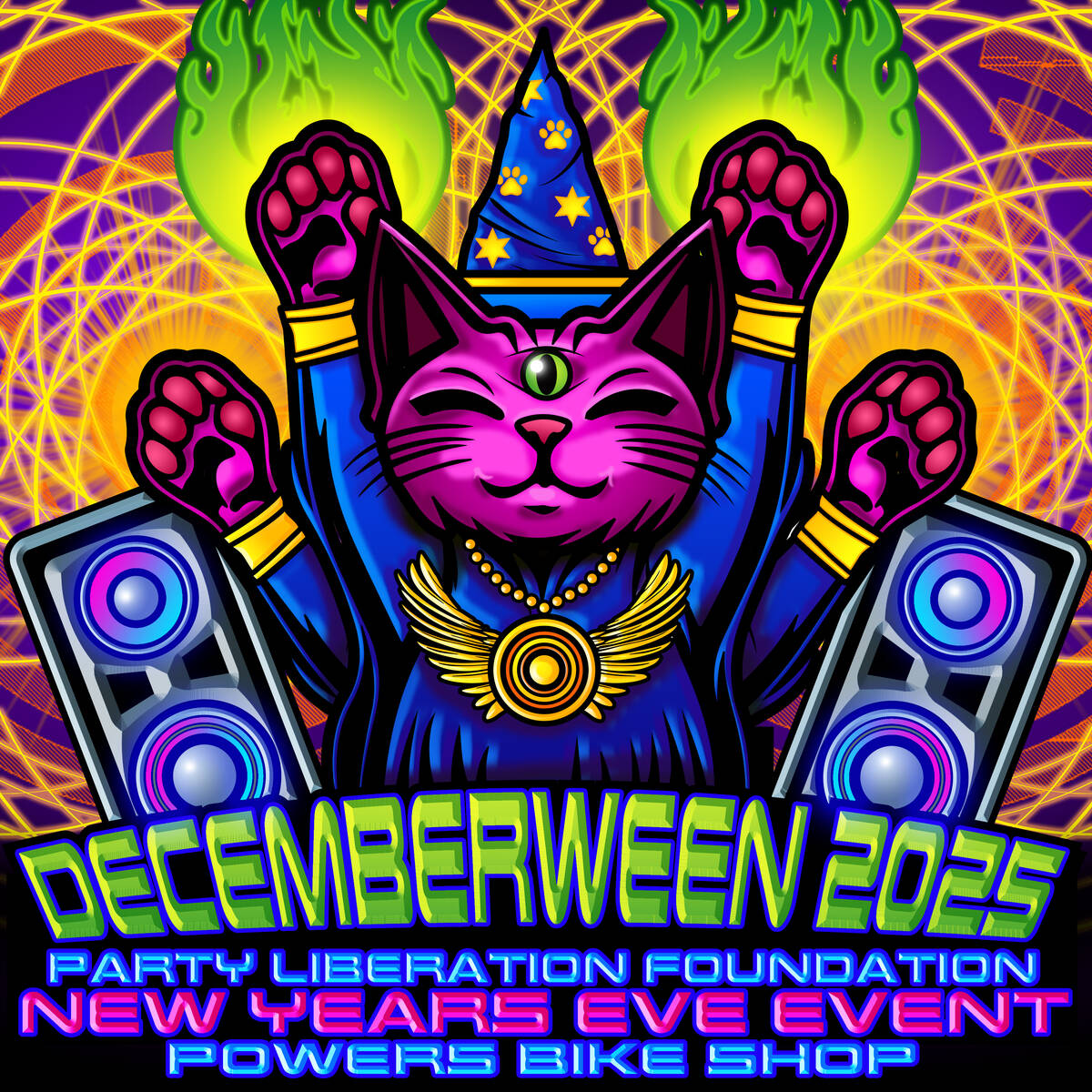 This year, the Party Liberation Foundation (PLF) is bringing the annual New Year’s Eve Decemberween bash to Powers BMX Shop! Since our start, Decemberween has grown from intimate house parties and basement gatherings into Richmond’s biggest NYE celebration. But this time, we’re going back to our roots with a more personal touch, rekindling the vibe of our early years while still delivering a full lineup of entertainment, art, and surprises.