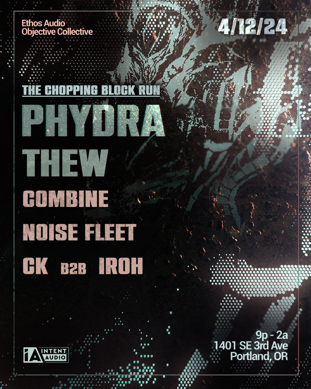 Join us Friday, April 12th as Objective Collective & Ethos Audio Present Phydra, Thew, Combine, Noise Fleet, CK b2b Iroh in a newly-renovated industrial space in Central SE Portland. this will be our heaviest show yet on Ethos Audio's Intent Audio sound system, in a space that is perfectly fit for the heavyweight energy. Phydra & Thew's Portland stopover for the "The Chopping Block Run" is surely going to be one for the books, with a fully stacked billing from open to close. Support for this show includes Portland's recent UK transplant Combine, Objective Collective roster artist Noise Fleet, and the debut b2b between some of our local favorites CK and Iroh. Early bird tickets are only $15, act fast to secure your spot!
