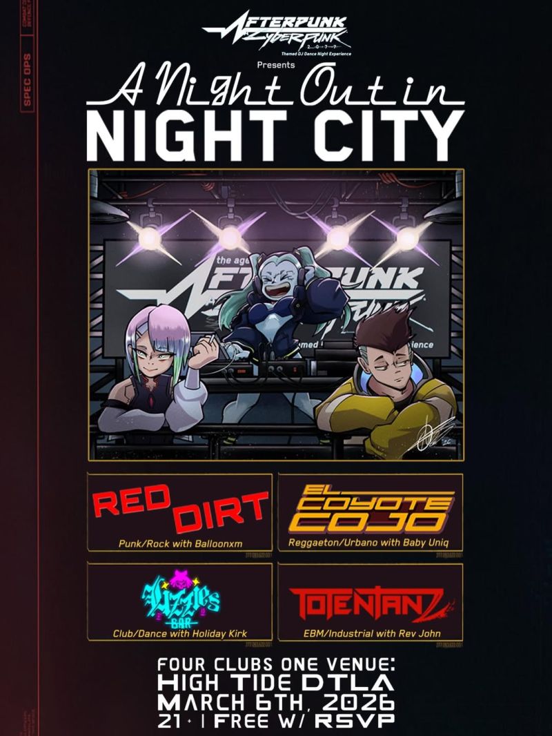 The world of Cyberpunk 2077 is vast and its many quests will take you many different places but you're guarenteed to end up at a bar before long. On March 6th, 2026 we're expanding our purview from just one bar to four. Our Afterpunk and Lizzie's Bar playlists lean towords the dance and pop end of the musical spectrum, A Night Out in Night City is our way of tilting in a few other directions. If you're into the game's rock selections you'll love Red Dirt with Balloonxm. If you've ever been disapointed that we don't integrate the game's excellent reggaeton tracks into our sets more you're going to be hype for El Coyote Cojo with Baby Uniq her. If you love our usual fare then Lizzie's Bar with Holiday Kirk is for you. And if you want to throw down to some heavy industrial beats Revjon has you covered with Totentanz.
