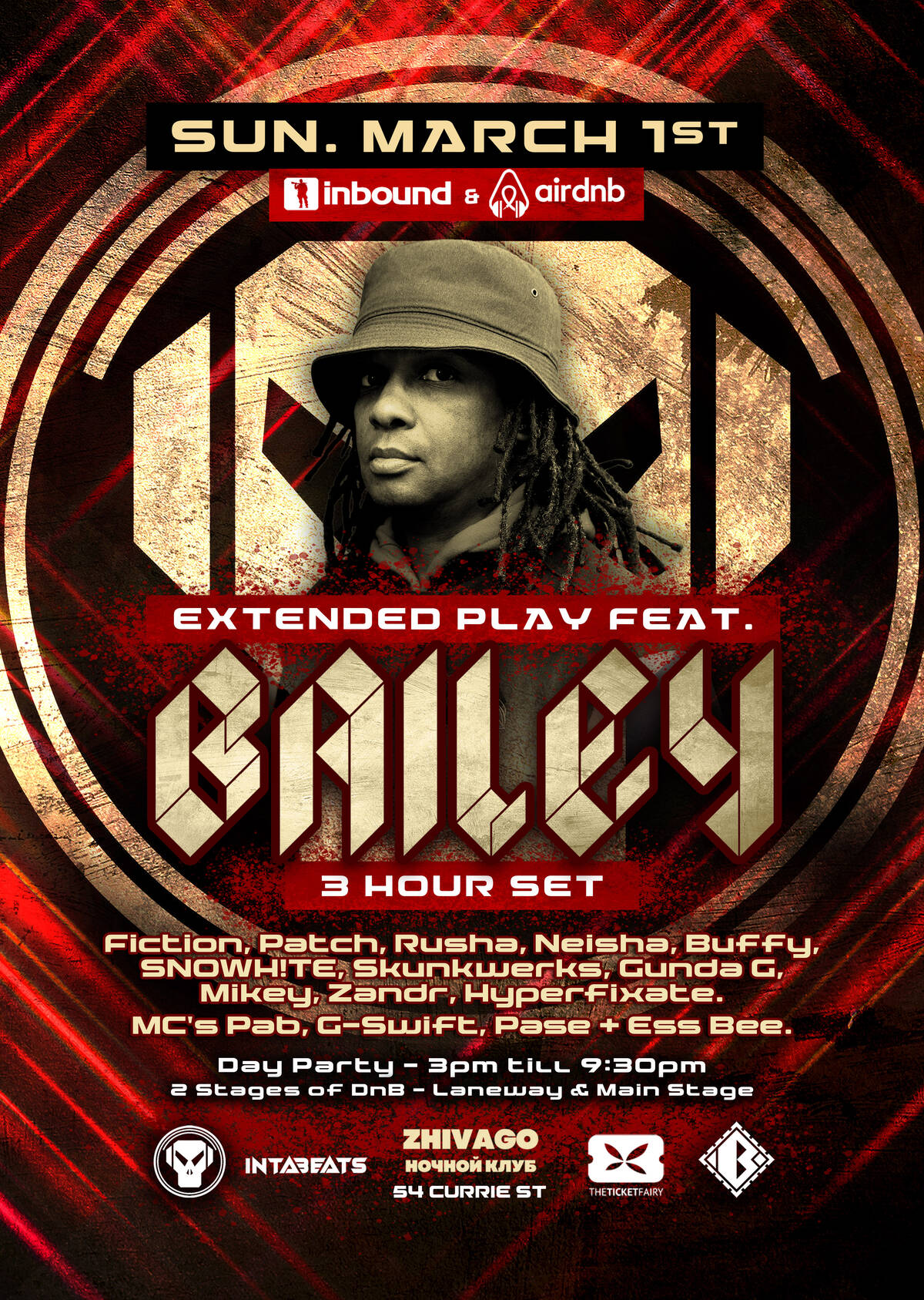 INBOUND & AirDNB join forces to present one of our absolute favourite DNB Artists, DJ Bailey, performing an extra long set of at least 3 Hours supported by so many of Adelaide's finest DNB selectors over 2 stages at Zhivago Inside and in the Laneway. We will be upgrading the sound and stage setup for this show. We really love the venue but want to make sure the setup is extra special for this one.