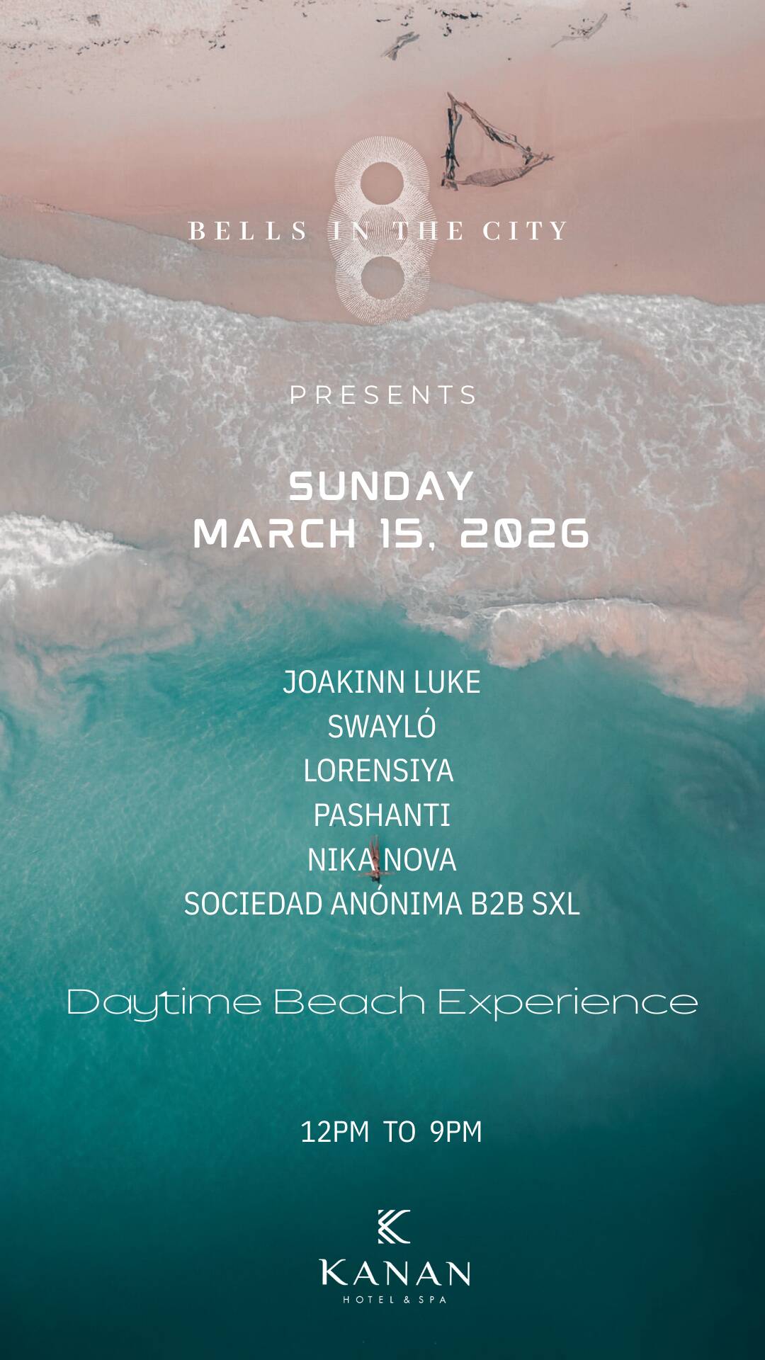 SUNDAY MARCH 15,2026 Bells in the City invites you to an exclusive open-air beach experience at Kanan Tulum.
