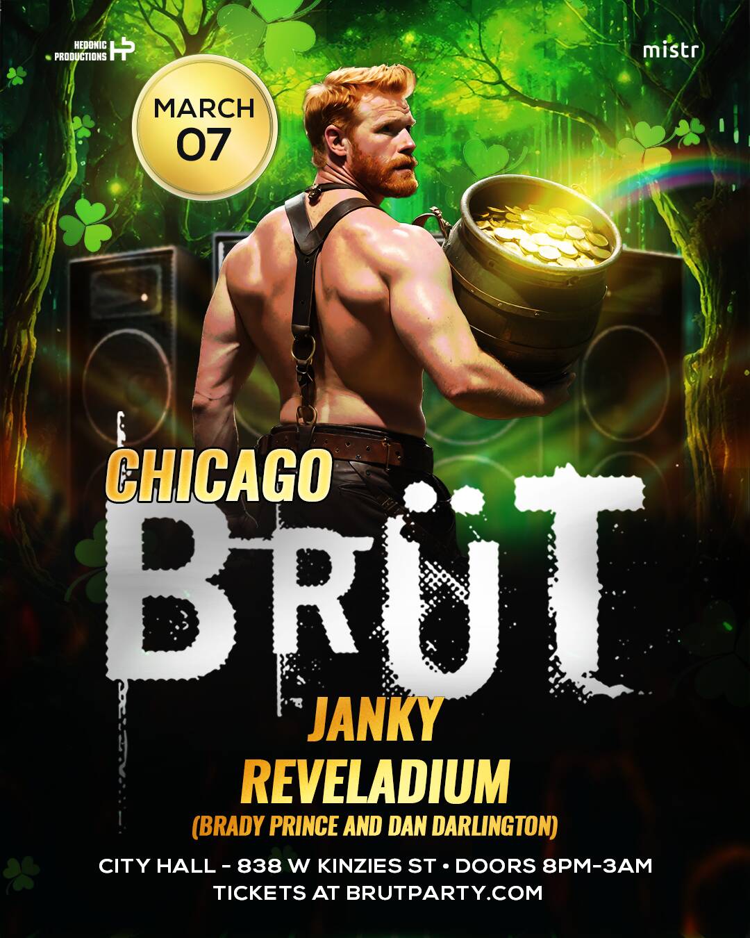A new kingdom stands larger, louder, built to be taken. Inside these walls, the gold isn’t waiting at the end of the rainbow, it’s already moving through the crowd, in the bodies, the heat, and the shadows. BRÜT kicks things off with one of the most epic gay parties in Chicago, perfectly timed for the legendary St. Patrick’s Day Parade, the Saturday night one week before the holiday.