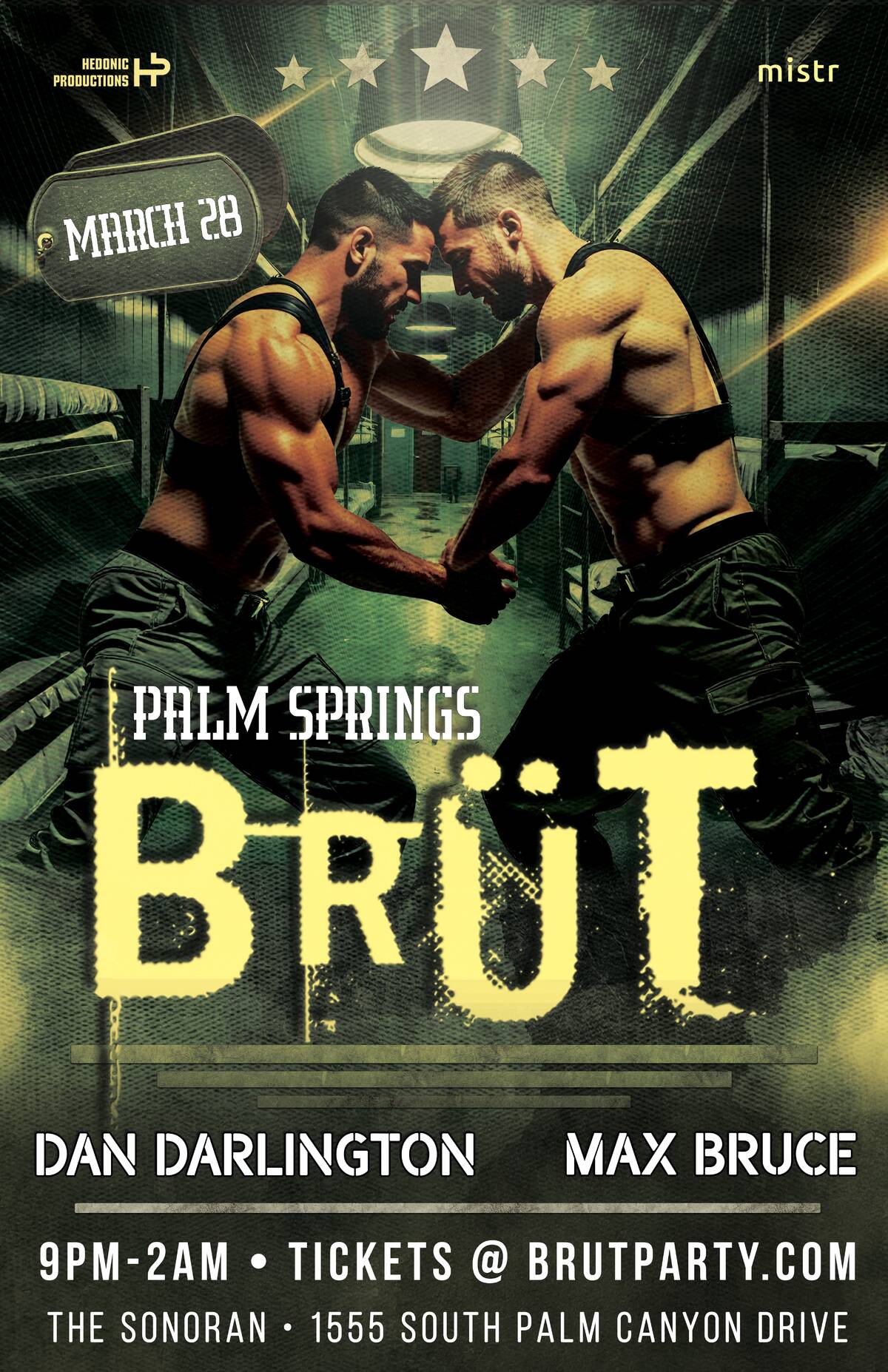 Raw force and controlled chaos collide in Palm Springs. Built on discipline, precision, and momentum, the night activates with commanding bodies, driving rhythms, and a pulse that takes control of the floor fast. The BRÜT Signal is live over gay nightlife in Palm Springs. Gear up, lock in, and fall into formation—we’re lighting the way and calling everyone into active duty for a night of pure insanity and the sexy chaos you only find at the BRÜT Party.