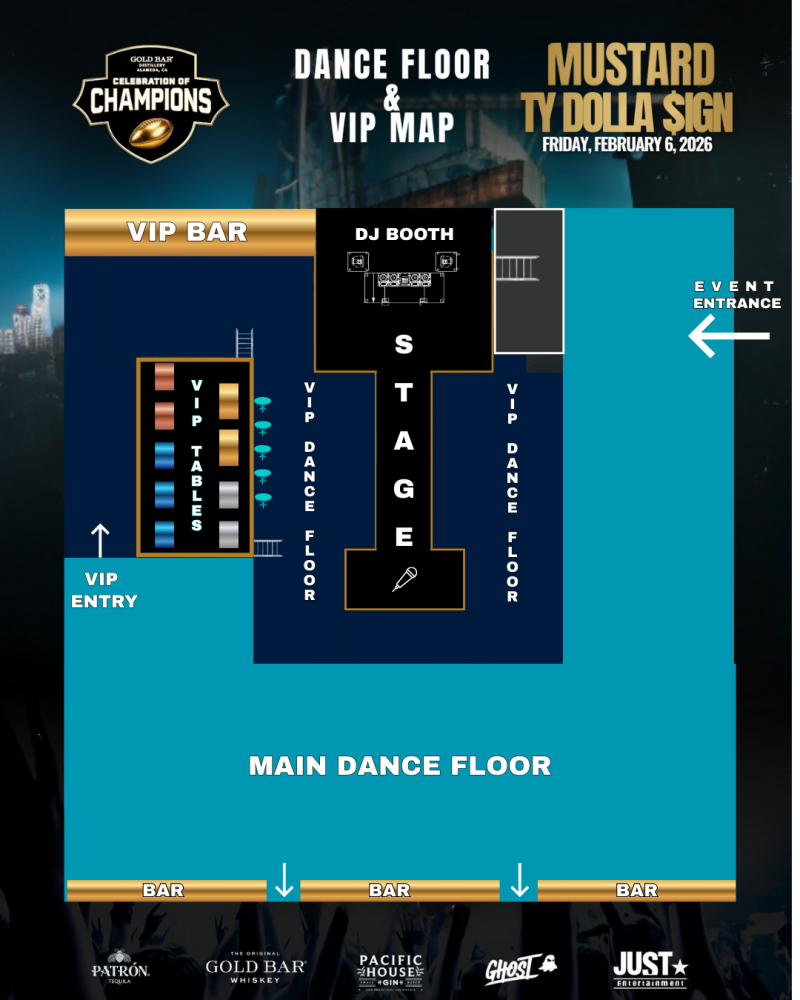 Celebration of Champions friday night, transforms Gold Bar into a full-scale nightlife experience. Inside the massive hangar-style venue, expect headline performances, high-energy DJ sets, immersive lighting and sound, and nonstop movement as Big Game Weekend hits full stride.