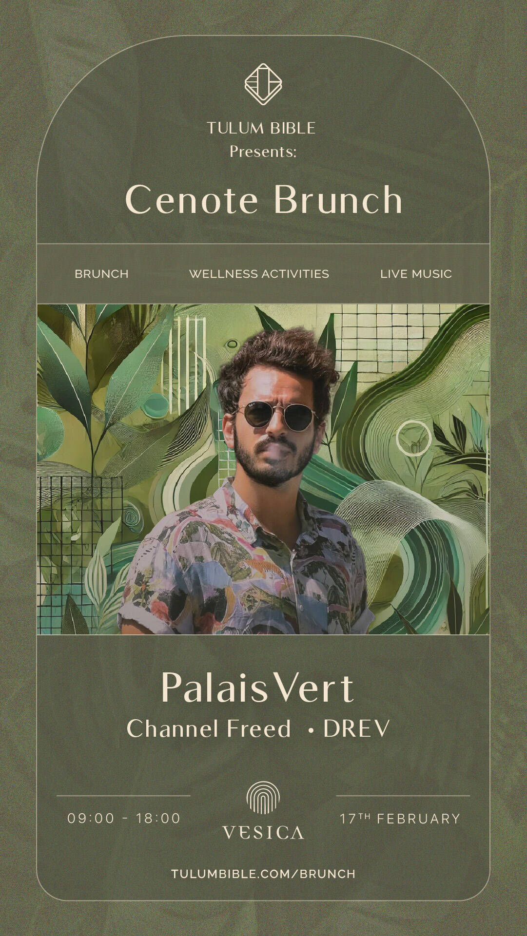 On Monday, February 17th, the Cenote Brunch at Vesica Tulum welcomes a special edition featuring PalaisVert, the French producer and DJ known for his luminous, ethnic, and cinematic electronic sound. With influences from his travels across five continents, PalaisVert crafts a melodic journey that blends organic rhythms, deep house, and afro-infused beats.