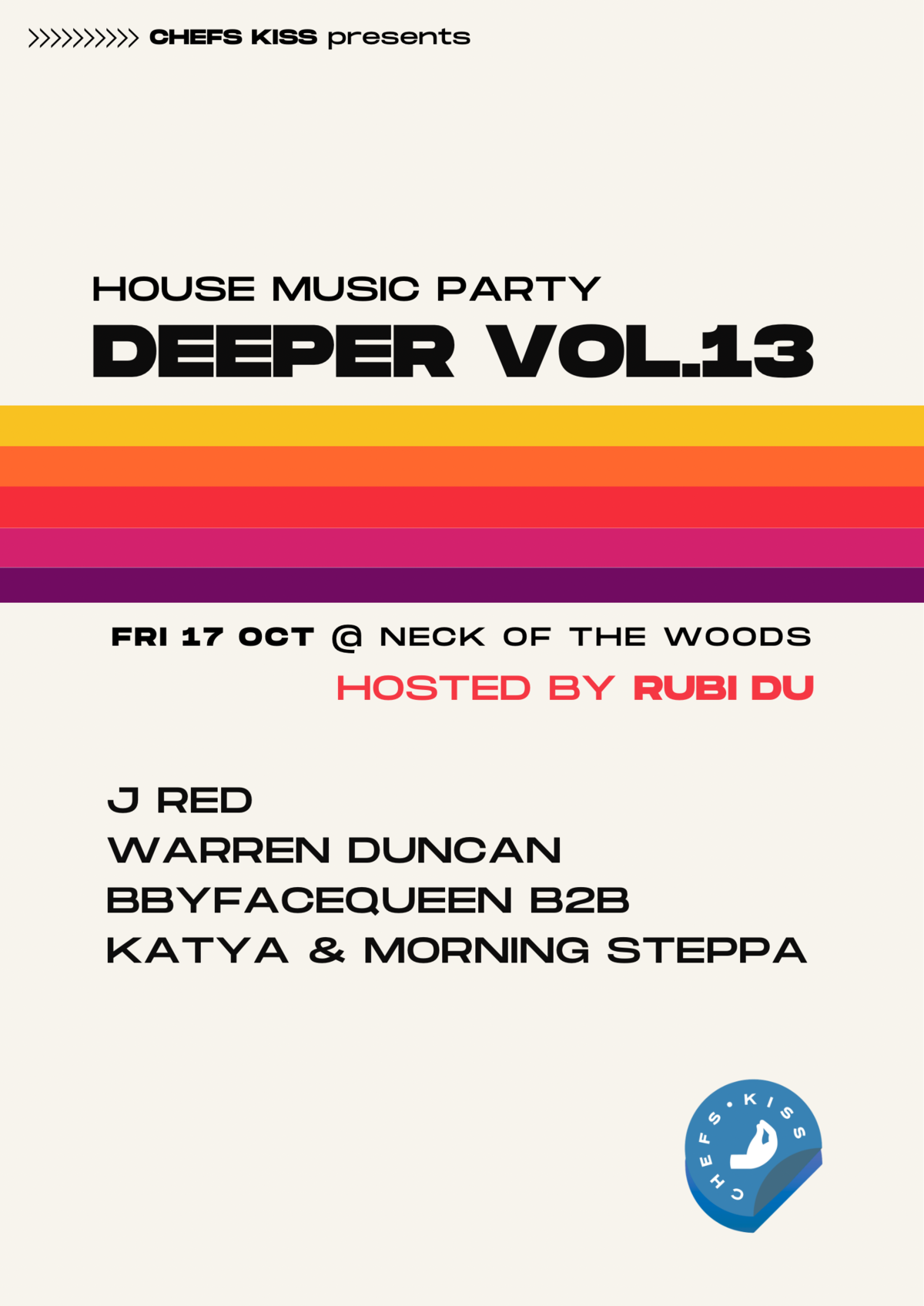 DEEPER is a House music party based in Auckland, brought to you by Chefs Kiss (DJ's Katya & Morning Steppa). They carefully handpick DJ's and encourage them to interpret House music from their individual perspective. This includes genres that inspired (Soul, Disco, Funk) to genres inspired by (Brokenbeat, Amapiano, Garage and so on) the House movement. Each set is a unique journey reflecting each DJ's personal story, style and relationship with House music.