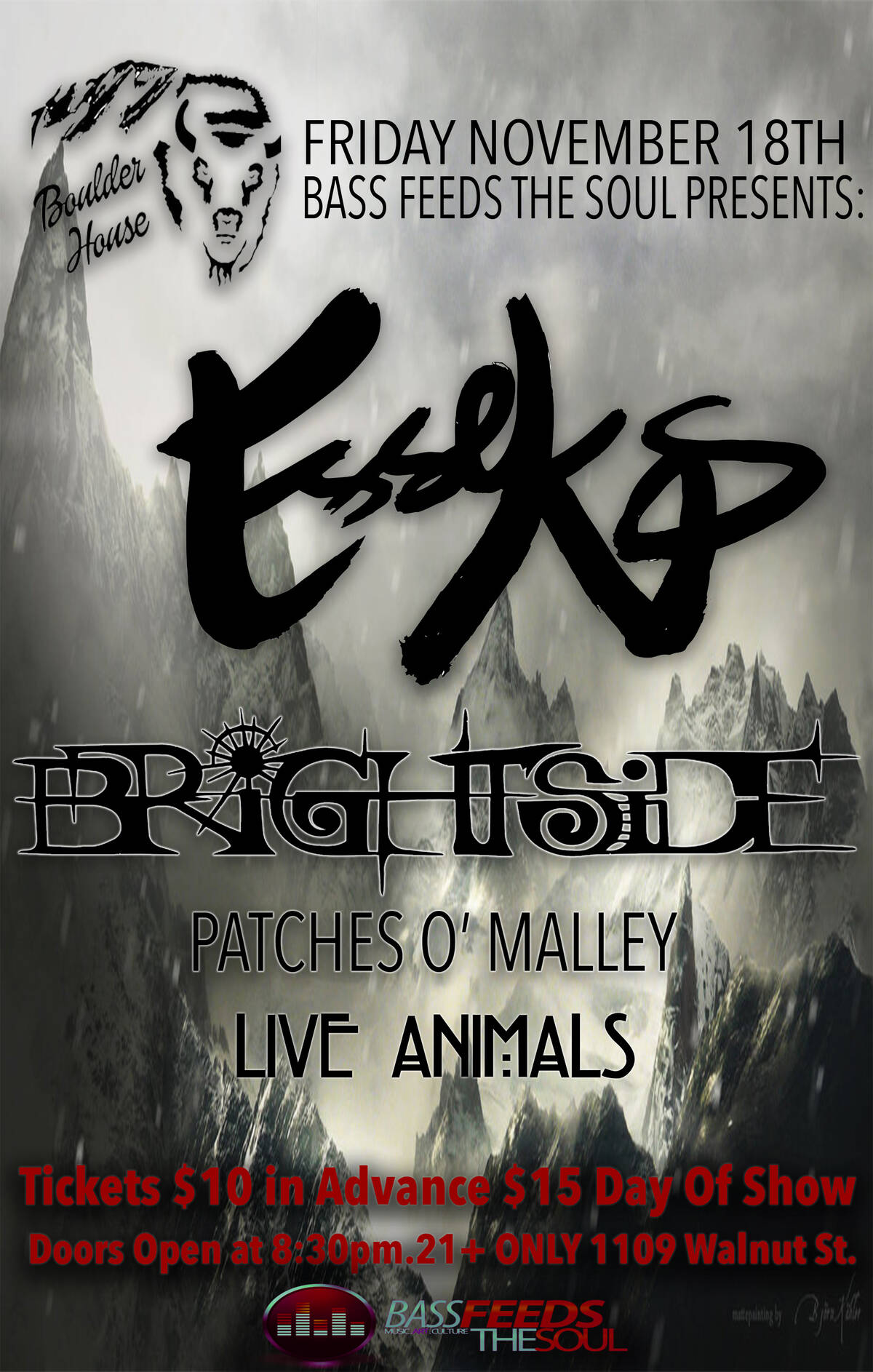 Bass Feeds The Soul and Boulder House are thrilled to bring you Esseks, Brightside, and Patches O'Malley with more local support TBA!!!