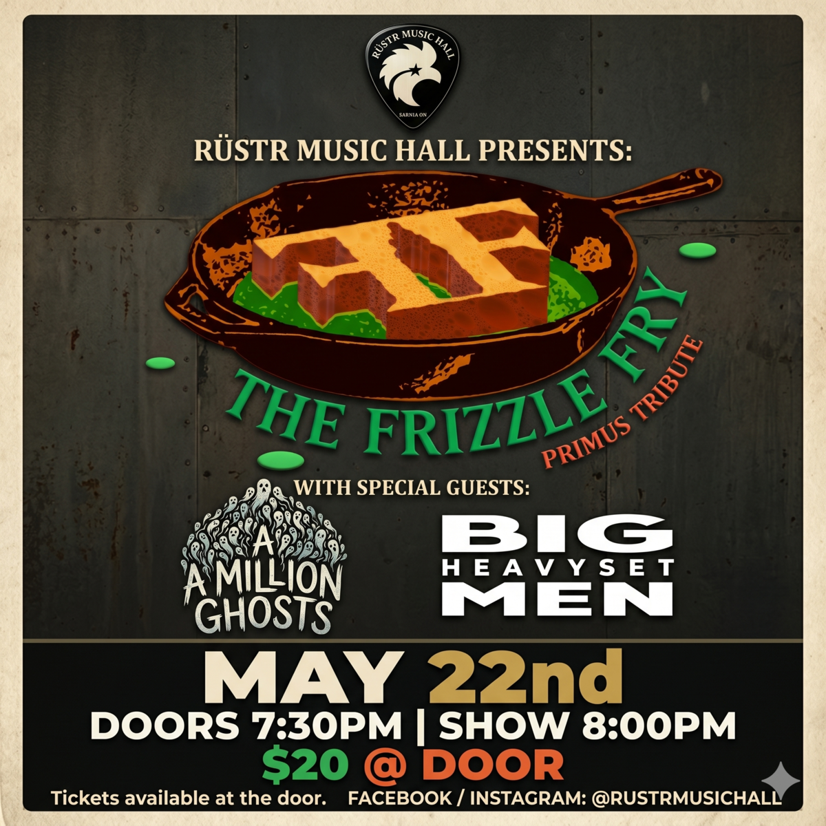 Sarnia, get ready for a weird and wonderful night! Rustr Music Hall is thrilled to present THE FRIZZLE FRY, a full-blown tribute to the legendary sound of PRIMUS, taking over the stage May 22nd! This isn't your average show – expect deep bass, quirky tunes, and a high-energy performance.