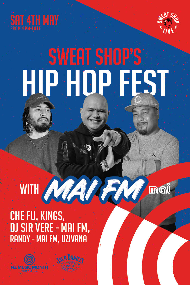On the first Saturday of NZ Music Month, Mai Fm presents Hip Hop Fest live at Sweat Shop Brew Kitchen 🎤⚡️ Prepare for a night of big hip-hop hitters, and party tracks headlined by Kings, Che Fu & DJ Sir Vere. Joining the crew is Randy & Uzivana to round out this stacked lineup.