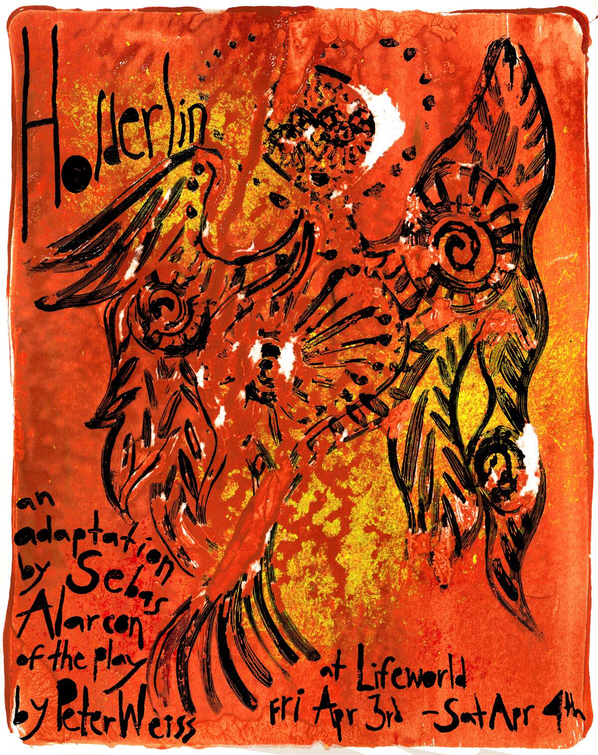 A sequence from Peter Weiss’ tragedy Hölderlin adapted by Sebas Alarcon. The play stages an ensemble performance about the early life of Friedrich Hölderlin, a 19c German poet who wrote his best work in a thirty year period of wholly isolated madness. The play doesn’t take that madness as romantic, rather as a result of political, sexual, and creative defeats that made him worse: political, because Hölderlin was a would-be revolutionary in a time of reaction; and sexual, because he suffers from our contemporary maladaptive sexualities, featuring porn-bred kids, moral panics, imperial cucks, and love most sweet when impossible to realize. We take Hölderlin’s madness as an experiment in making political -- didactic theater, even -- that is fun & rigorous.