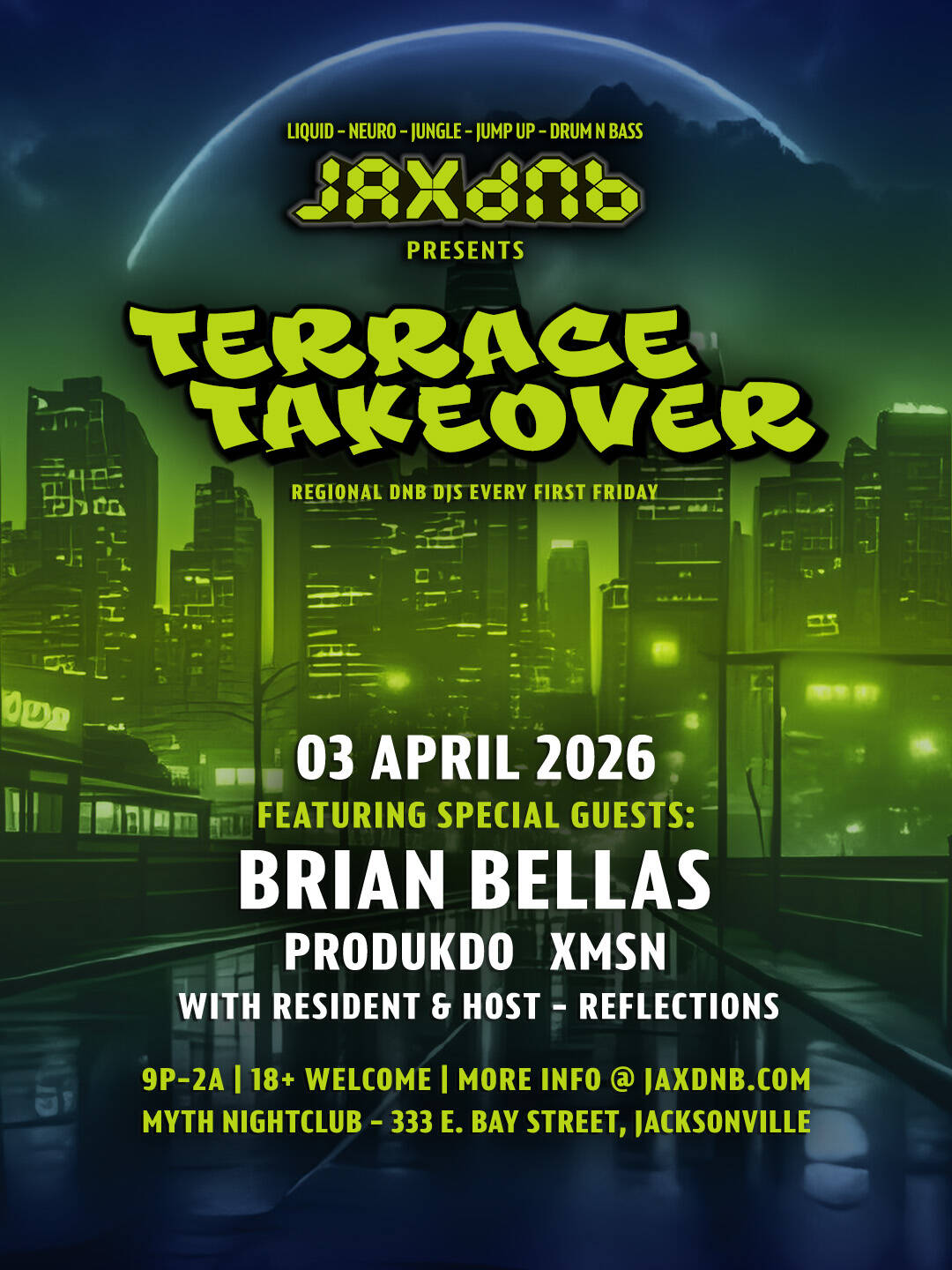 It's a busy weekend for us but that doesn't stop the Terrace Takeover! Join us as we rock out the Myth Terrace all night with JaxDNB artists Brian Bellas, PRODUKDo, XMSN, and resident Reflections.