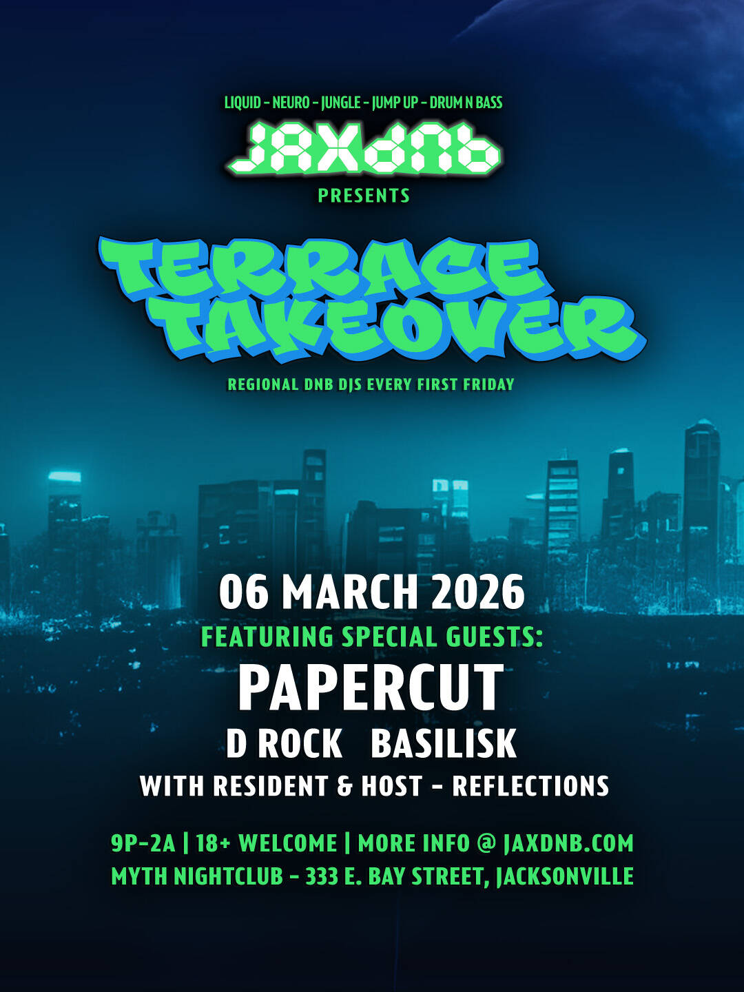 It's a busy weekend for us but that doesn't stop the Terrace Takeover! Join us as we welcome Papercut for his JaxDnB debut, alongside D Rock, Basilisk, and resident Reflections.