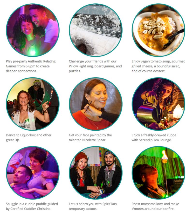 You'll leave the games with a sense of well-being and tools you can use to add depth and play to your interactions all evening at the Pillow Party and beyond.
