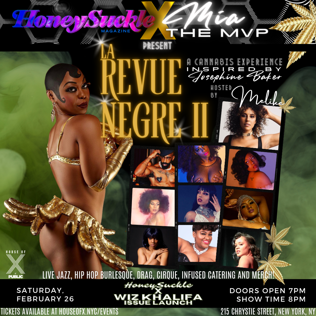 NYC's Josephine Baker, Mia "The MVP" partners with Honeysuckle Magazine as they celebrate their February Black History Month edition with Wiz Khalifa on the cover! Cannabis, culture, and social justice! La Revue Negre II: A Cannabis Experience Inspired by Josephine Baker! is an immersive, glitzy, glamorous, cannabis-infused celebration of Black History Month. Josephine Baker returns for one night only to inspire a night of burlesque, cirque, live jazz, swing, and hip hop.