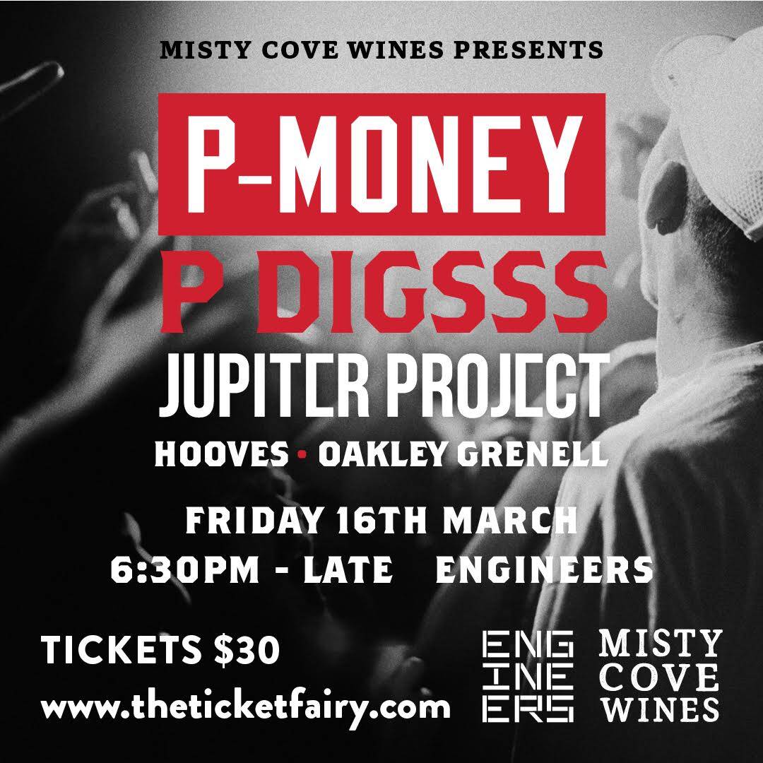 Misty Cove Wines in conjunction with Engineers are proud to present an all-star New Zealand line-up featuring P-Money, Shapeshifter’s PDigsss, Jupiter Project, Hooves and Oakley Grenell on March the 16th, 2018 from 6.30pm.