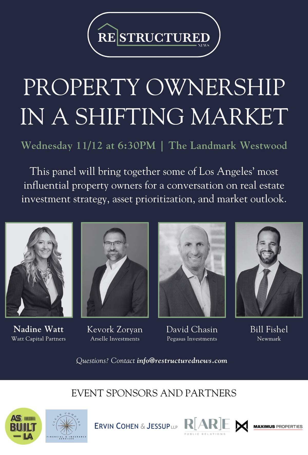 Join us at this RE|STRUCTURED LIVE panel event, where Bill Fishel, Executive Vice Chairman at Newmark, will lead an engaging conversation amongst Nadine Watt, CEO of Watt Capital Partners, Kevork Zoryan, Founder and Managing Partner of Arselle Investments, and David Chasin, CEO of Pegasus Investments. Together, they represent some of Los Angeles’ most influential property owners, coming together for a discussion on strategy, asset prioritization, and market outlook.