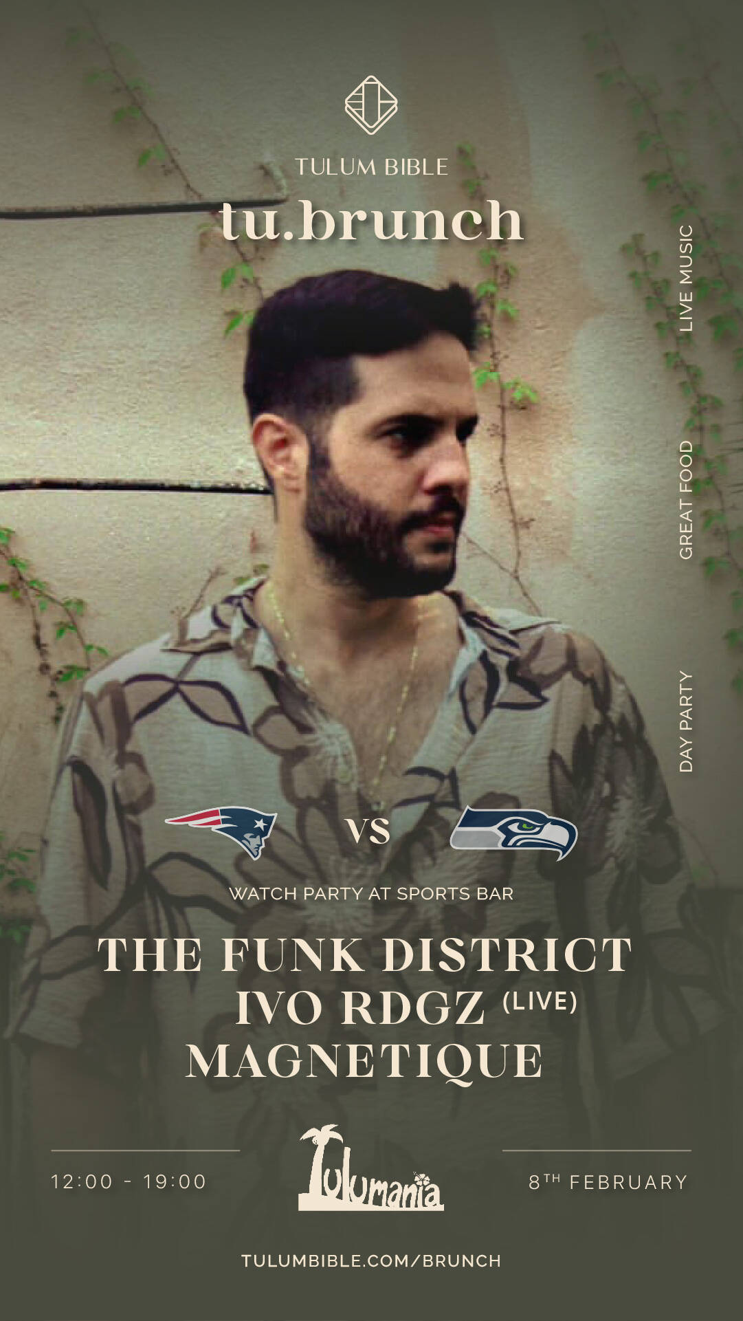 Tu Brunch at Tulumania this Sunday with The Funk District, Ivo Rdgz (live) and Magnetique. Daytime party, great food, live music and a Super Bowl watch party to close the day.