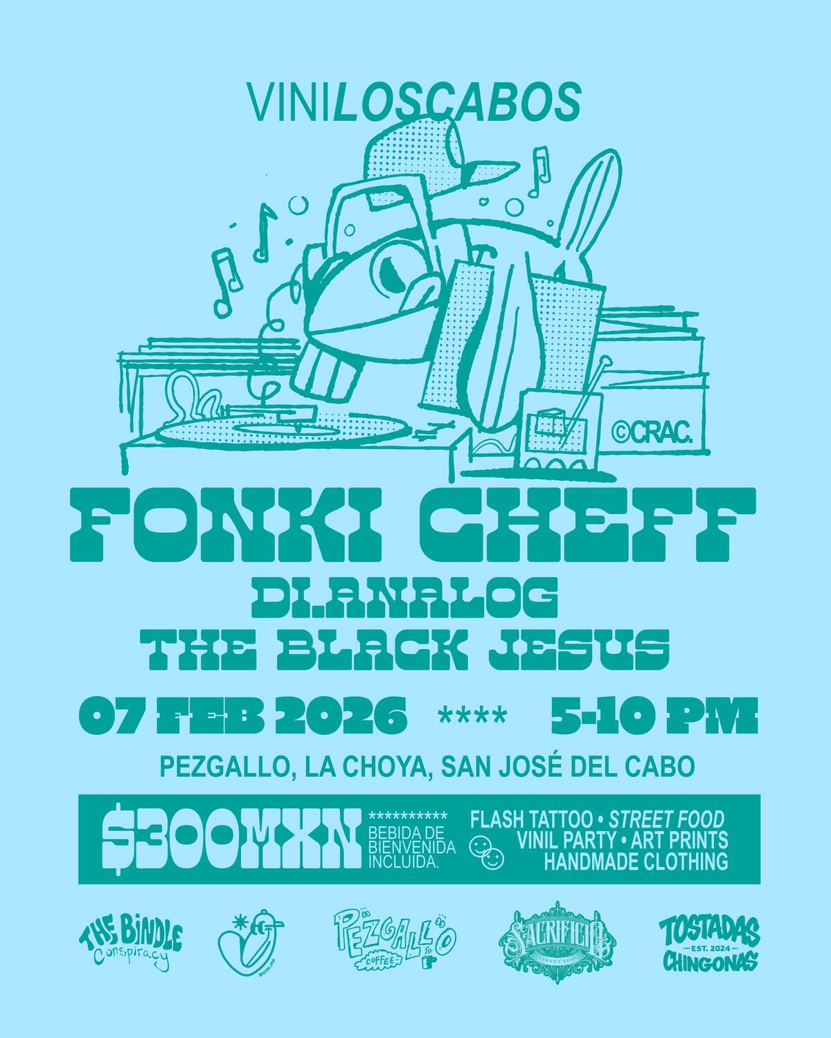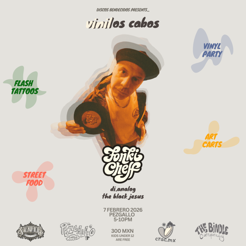 We welcome Spain's, Fonki Cheff, to the vibrant vinyl music scene of Los Cabos to celebrate the finest elements of music, art and culture. On the dancefloor, expect curated vinyl selections across tropical disco, funk, hip hop, reggae, cumbia and more. Surrounding the music, notable local creators will be offering flash tattoos, artwork, clothing, food and refreshments — ensuring that there's something for everyone. Join this intimate gathering full of positive vibrations and delicious libations, in partnership with Pezgallo. Please celebrate responsibly.