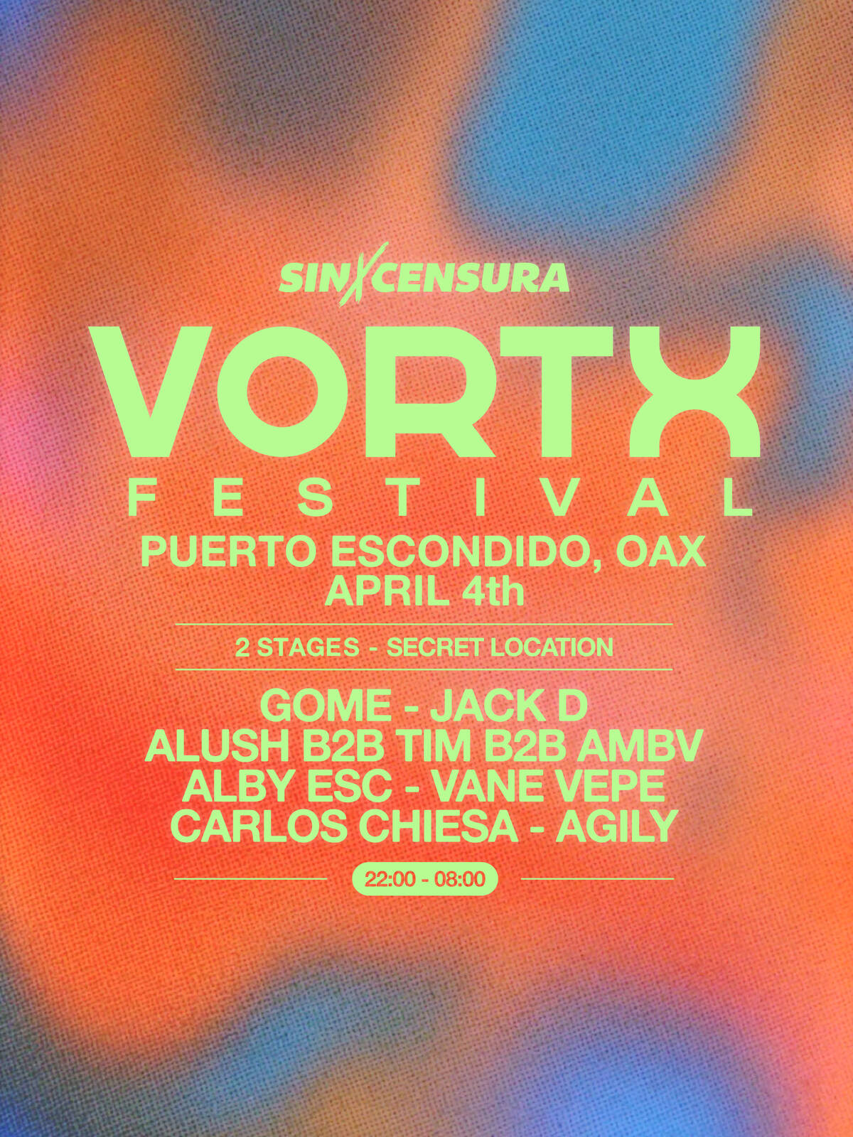 VORTX returns to Puerto Escondido for its 5th edition — a two-stage experience with house and techno in an open-air setting surrounded by nature.
