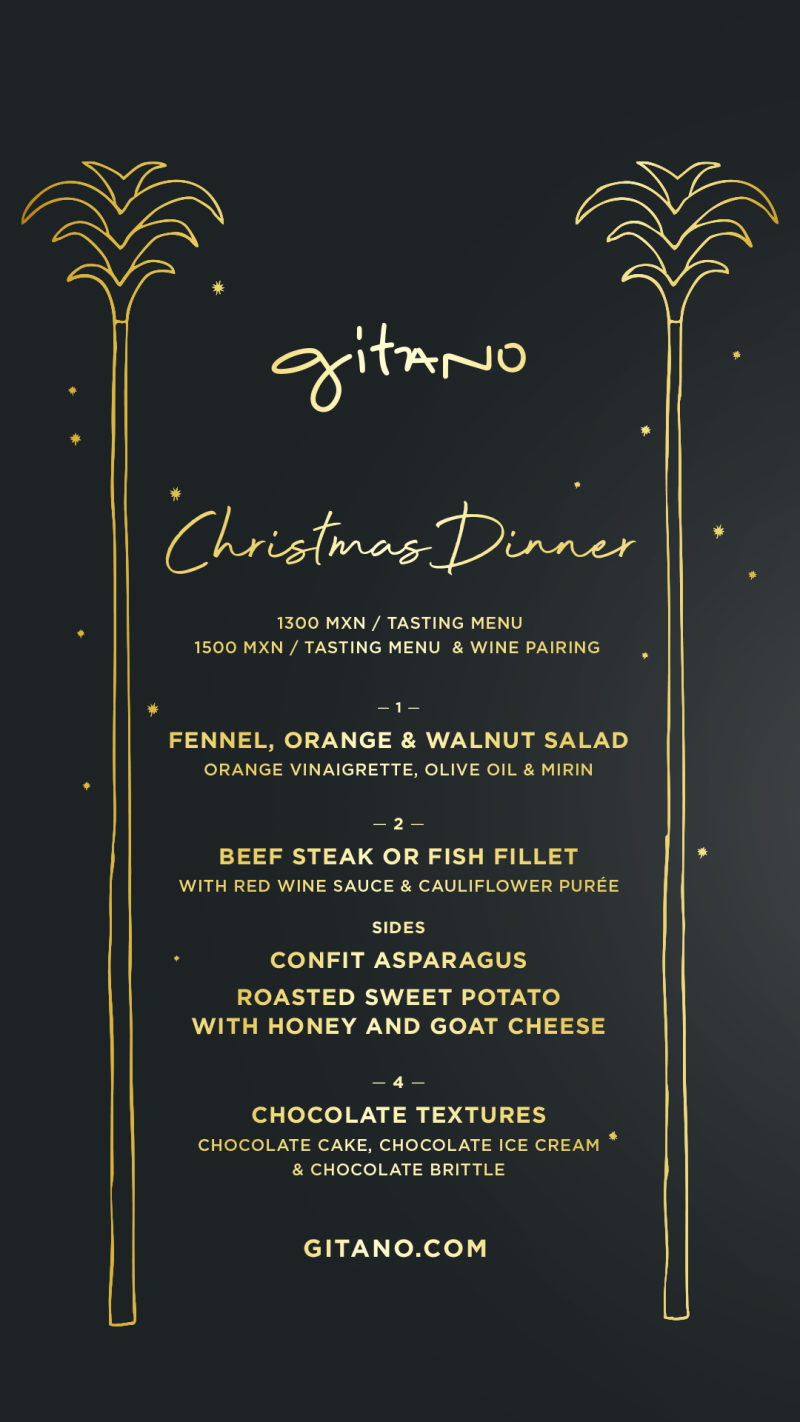 As the sun sets, gather for a three-course Christmas tasting menu, a beautiful blend of tradition and tropical flair. From fennel and orange salad to tender beef steak or fish fillet, each dish captures the warmth of the season with a Gitano twist. End the evening with indulgent chocolate textures as the sky turns gold over the ocean.